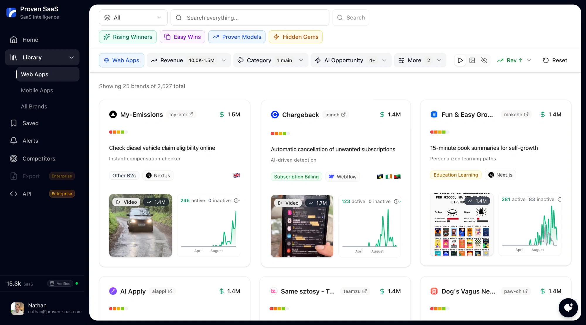 Browse our database of 14,500+ proven SaaS products. Filter by niche, revenue, and growth rate.